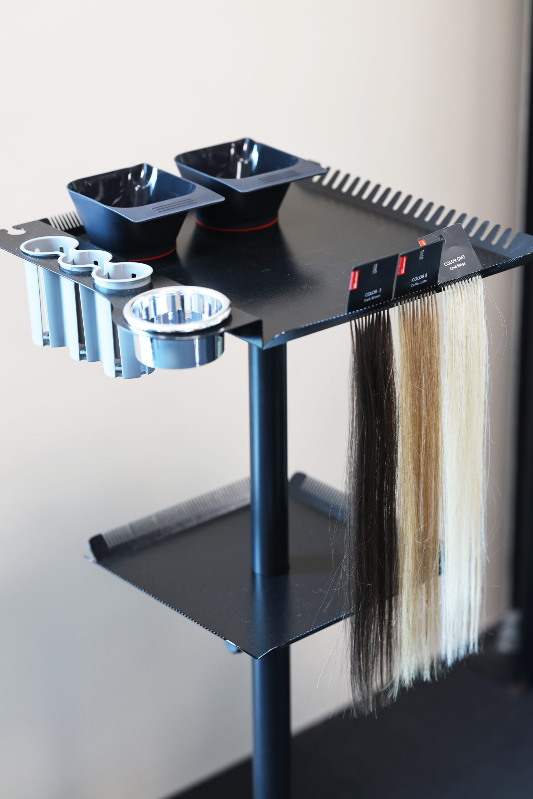 Der Extensions-Trolley ist die perfekte Lösung für professionelle Friseure und Stylisten, die mit Haarverlängerungen arbeiten. Ob Tape-Ins, Wefts oder Bondings – dieser mobile Organizer bietet maximale Übersicht, Flexibilität und Effizienz während der Anwendung.